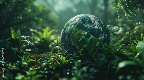 A small green globe sits amidst lush vegetation in a serene forest environment, ideal for use in environmental or eco-friendly themes