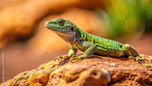 A small green lizard lies on a large, brown rock in the desert landscape, with its scaly body and tiny legs exposed , reptile