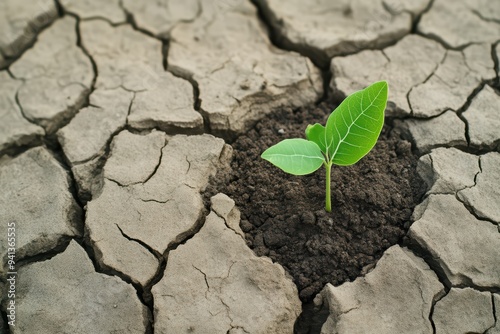 A small green plant emerges from cracked earth, symbolizing resilience and hope in challenging conditions.