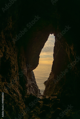 A small opening in a rock wall with the ocean in the background. The sky is a mix of orange and blue.