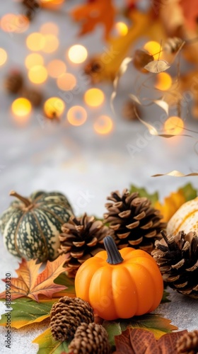 A small, orange pumpkin sits surrounded by pine cones, autumn leaves, and blurry lights.
