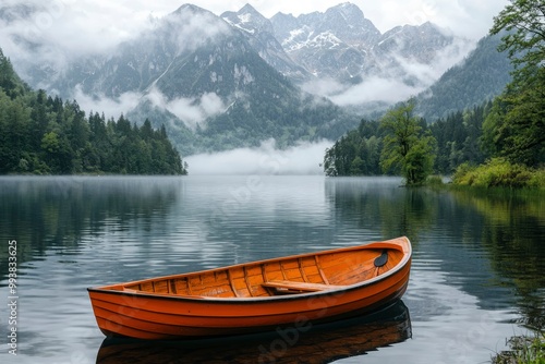 boat, wooden, orange, small, calm, lake, water, mountain, mist, covered, mountain, tree, green, forest, still, surface, peaceful, tranquil, serene, scenic, landscape, nature, travel, wilderness, journey, adventure, idylli, breathtaking, majestic