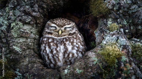 A small owl, with closed eyes, rests peacefully within a tree's hollow