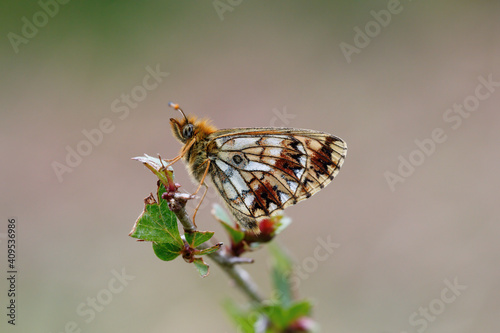 A Small Pearl-bordered Fritillary perch on the end of a hawthorn branch.
