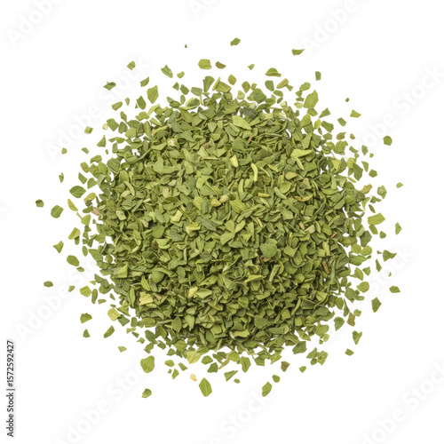 A small pile of dried green chopped parsley flakes, with scattered individual flakes, isolated on a transparent background with shadowless lighting, shot overhead, high contrast, concept for