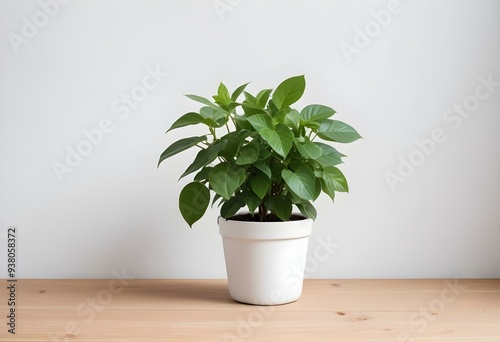 A small potted plant with green leaves on a wooden surface against a white wall.