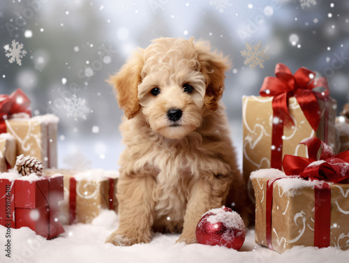 A small puppy is waiting for his owner in the snow next to Christmas presents. Cute little animals at Christmas. digital AI