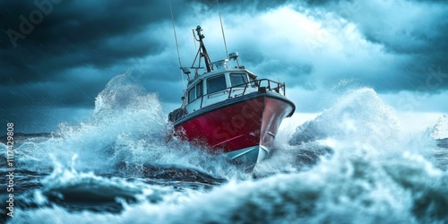 storm, boat, wave, ocean, sea, stormy, red, nature, water, danger, turbulent, weather, fishing, marin, adventure, sailing, rescue, power, wild, crash, splash, courage, journey, powerful, dynamic, oceanic, fury, ship, fishing gear, dark clouds, scenic, awe, intense, surge, struggle, motion, fisherman, brave, heroic, adverse, ai