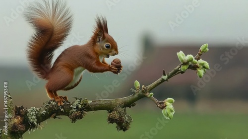 squirrel, nut, tree branch, tree, nature, red, brown, animal, wildlife, forest, spring, outside, closeup, small, cute, food, eating, holding, detail, wild, tail, fur, springtime, detail, portrait, sharpened, meadow, outdoors, background, blur, natural, blood-red, green, image, photo, adorable