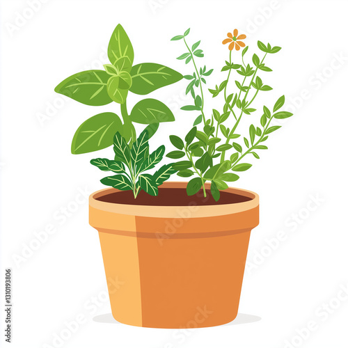 A small terracotta pot filled with fresh green herbs, including basil and thyme, creating a perfect mini herb garden for home kitchens