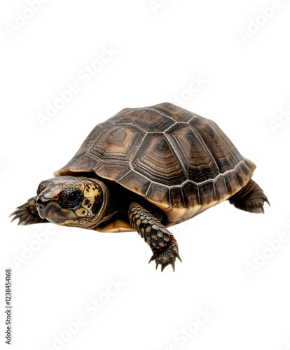 A small turtle with a patterned shell, resting comfortably on a white surface. Transparent background