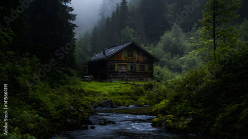 small, wooden, cabin, tucked, mountainside, thick, forest, tranquil, stream, flowing, nature, serene, peaceful, picturesque, rural, summer, fresh, vibrant, beauty, idylli, countryside, natural, rustic
