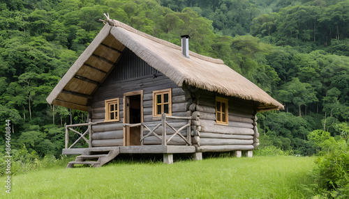 a small wooden cabin with a thatched roof, set against a backdrop of dense, green forest, showcasing the simplicity and charm of rustic living.