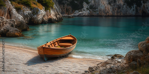 A Small Wooden Fishing Boat Resting on a Beach for Maritime Scenes, Coastal Illustrations, or Travel Promotion