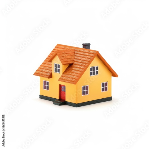 house, model, miniature, yellow, orange, terracotta, roof, building, home, small, three-dimensional, isolated, simple, design, property, architecture, illustration, cartoon, representation, exterior, front, perspective, single, isometric, cosy, residential, dwelling, family, modern, cute, charming, flat, rendering, real, image