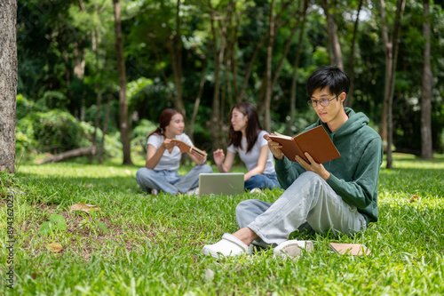 A smart, nerdy young Asian male college student is focused on reading a book in the campus park.