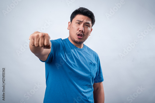 A smiling Asian man in a blue t-shirt extends his fist toward the camera in a friendly fist bump gesture. He exudes positivity, confidence, and encouragement against a clean white background