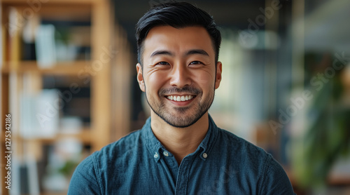 a smiling asian man: masterclass style interview behind him is a corporate office out of focus and bokeh