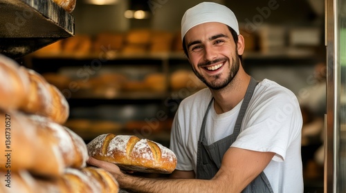 baker, bread, bakery, food, cooking, baking, fresh, happy, smiling, man, person, male, loaf, hand-made, artisan, warm, gold, delicious, tasty, white, flour, wheat, crust, texture, work, occupation, apron, hat, shelving, background, indoor, service, retail, shop, store, business, client, portrait, professional, hand, holding, arm, display, product, shelf
