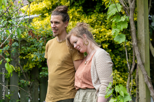 daytime, bonding, nature, outdoors, togetherness, human relationships, foliage, joyful, adult, woman, female, casual clothes, garden, content, smiling, companionship, affection, caucasian, male, landscaping, greenery, couple, man, leisure