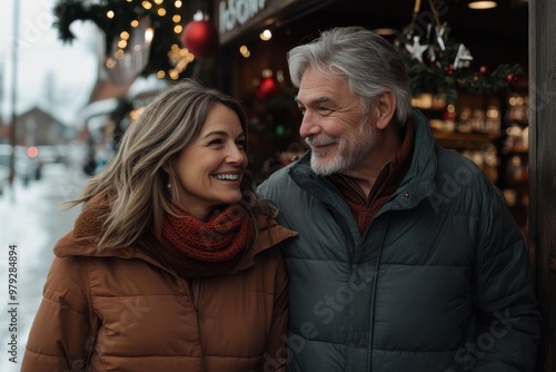 A smiling couple, warmly dressed, stroll together in a charming snow-covered street adorned with festive decorations, exuding joy and winter holiday magic.