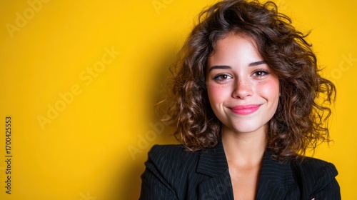 A smiling girl with curly hair in a stylish outfit against a vibrant yellow backdrop, radiating positivity, confidence, and youthful energy in a lively atmosphere.