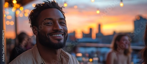 A smiling man enjoys a sunset view at a lively outdoor gathering.