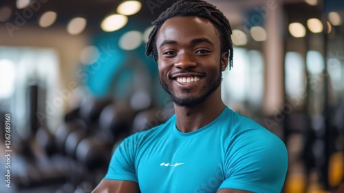 A smiling man in a vibrant workout outfit stands confidently in a brightly lit gym, surrounded by modern fitness equipment