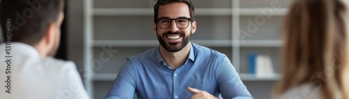 A smiling man in glasses engages with two people during a discussion in a bright, modern office setting.