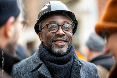 man, smiling, happy, face, eye, goggles, hard hat, helmet, construction, men at work, black, beard, goatee, stubble field, grey, jacket, coat, foulard, white, teeth, skin, hair, ear, nose, chin, neck, mouth, fashion, clothing, urban, street, city, outside, day, people, crowd, casual attire, portrait, sharpened, blur, background, light, shadow