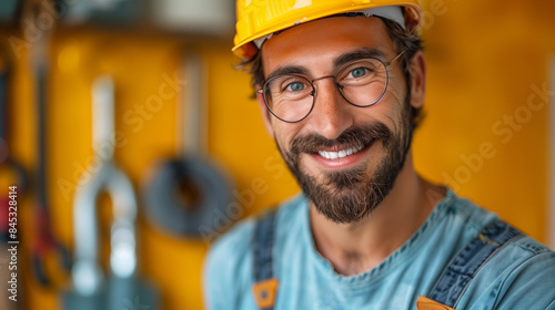 man, men at work, craftsman, workshop, tool, hard, hat, overall, smile, confidence, skilled, profession, construction, industry, repair, maintenance, work, labor, blue, collar, engineer, technician, mechanic, electrician, plumber, carpenter, building, industrial, safety, equipment, project, job, trade, manual, craft, handyman, yellow, beard, goggles, portrait