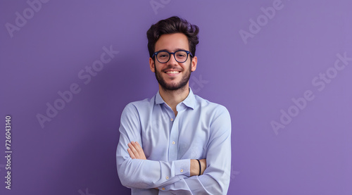 a smiling man wearing glasses in front of a purple background