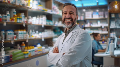 A smiling mature male pharmacist stands in a pharmacy. An artificial intelligence generated image.