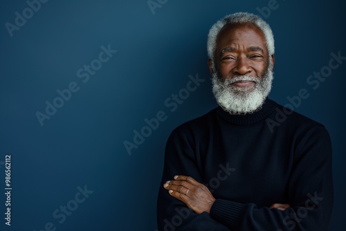 A smiling senior African American man poses confidently in a dark sweater against a deep blue backdrop, showcasing warmth and wisdom
