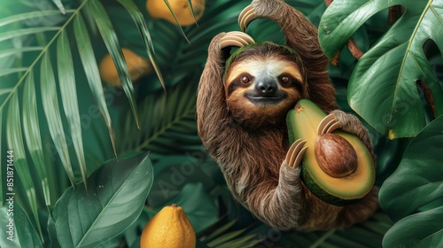 A smiling sloth hangs from a branch, holding a ripe avocado. Lush tropical foliage surrounds the sloth.