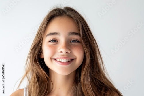 A smiling young girl with long brown hair