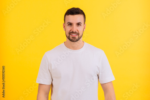 man, portrait, smiling, white shirt, yellow background, casual attire, young, confidence, happy, expression, male, confident, simplicity, friendly, joy, studio, cheerful, fashion, clean, adult, positive, attractive, modern, comfortable, standing, lifestyle, happiness, shirt, closeup, casual clothes, look, fresh, bright, person, isolated, beard, t-shirt, style, young men, indoor, beauty, simple, modern style, smiling face, fun, personality, facial expression, healthy