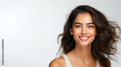 smile, young, woman, white, singlet, healthy, wellness, positive, fit, isolated, portrait, casual attire, background, female, fashion, lifestyle, studio, shot, 1, person, standing, model, adult, people, indoor, cheerful, happiness, sleeveless, top