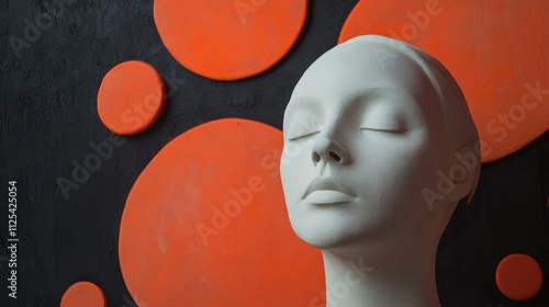 A smooth white sculpture featuring fine details rests against a backdrop of vibrant orange circles, adding depth and boldness to the modern artwork composition.