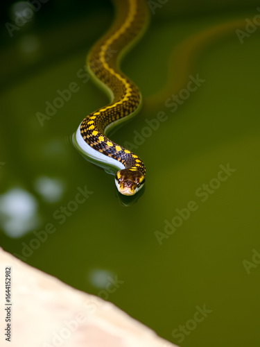 A snake resting in a pool of water. Suitable for nature and wildlife themes