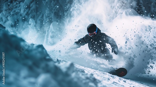 A snowboarder carves through fresh powder, creating a spray of snow as they navigate a steep slope.
