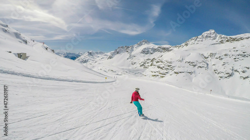 A snowboarder going down the slope in Moelltaler Gletscher, Austria. Perfectly groomed slopes. High mountains surrounding the girl wearing colourful snowboard outfit. Girl wears helm