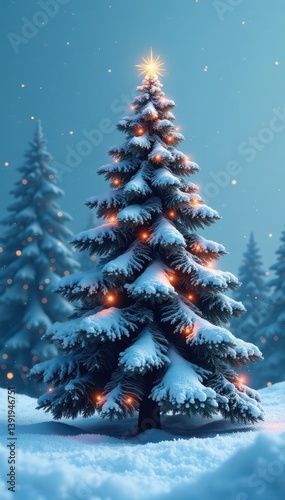 A snow-covered Christmas tree stands tall in a frosty landscape, holiday decor, winter forest