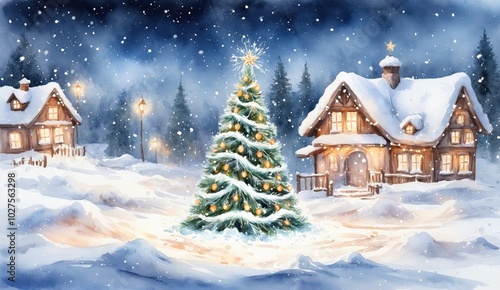 watercolor, house, snow, winter, light, tree, christmas, festive, cosy, night, sky, glowing, peaceful, holiday, forest, snowfall, snow-covered, warm, outdoors, wood, nature, serene, cold, frosty, seasonal, december, christmas lights, starry, landscape, white, celebration, decor, pine, quiet, rustic, mountain, holiday season, tranquil, star, winterly