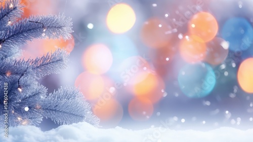 A snow-covered tree branch with a blurred background of colorful lights and snowflakes.