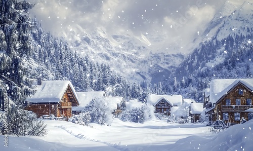 A snowy day in a mountain village, the heavy snow creating a picturesque winter scene, ideal for winter sports enthusiasts, Generative Ai