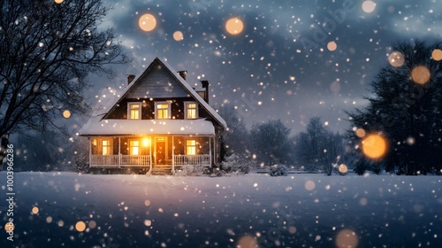 snow, winter, evening, night, house, home, cosy, warm, light, window, porch, tree, branch, sky, horizontal, copy space, wallpaper, white, flake, falling, cold, frost, season, landscape, rural, quiet, peaceful, magical, picturesque, outdoors, nature, illuminated, glowing, inviting, rustic, charming, idylli, village, snowflake, celebration, bungalow, decoration, scene, card, new year, poster, banner, holiday