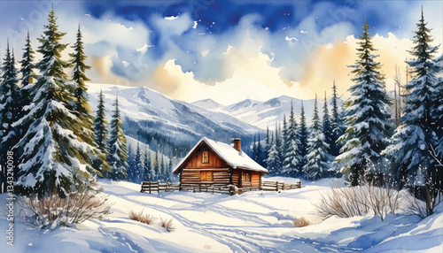 snow, illustration, watercolor, landscape, winter, nature, background, forest, blue, sky, cold, art, snowy, holiday, drawing, white, season, tree, snowfall, vector, mountain, christmas, design, abstract, light, travel, ice, card, frost, texture, fir, decoration, village, beautiful, painting, december, wood, house, pine, glacé, snowflake, artwork, scene, bungalow, paint, home, night, field