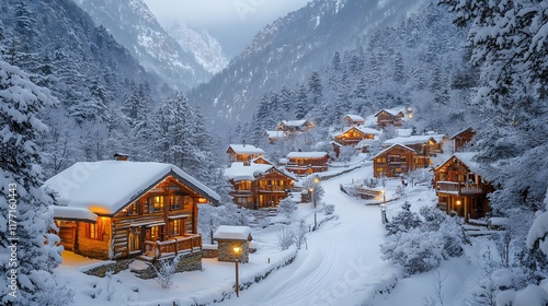 A snowy village nestled in a mountain valley, with charming cabins, winding paths, and snow-covered pines