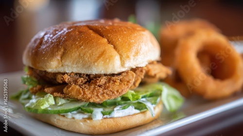 a soft bread bun with crispy fried soft-shell crab, lettuce, and ranch dressing on a white plate